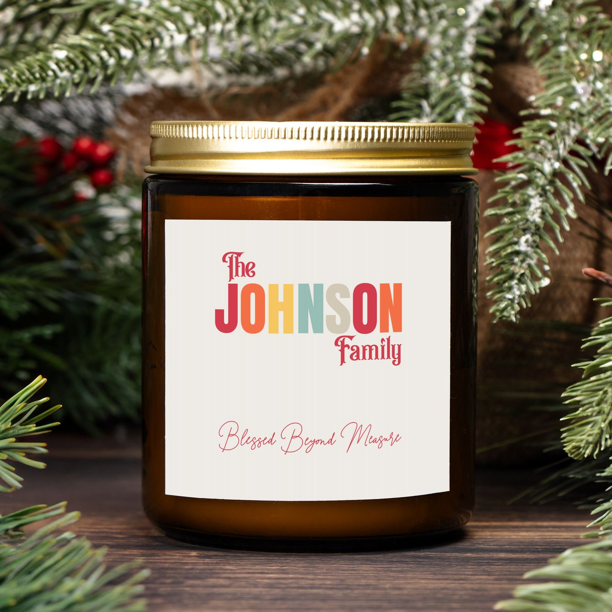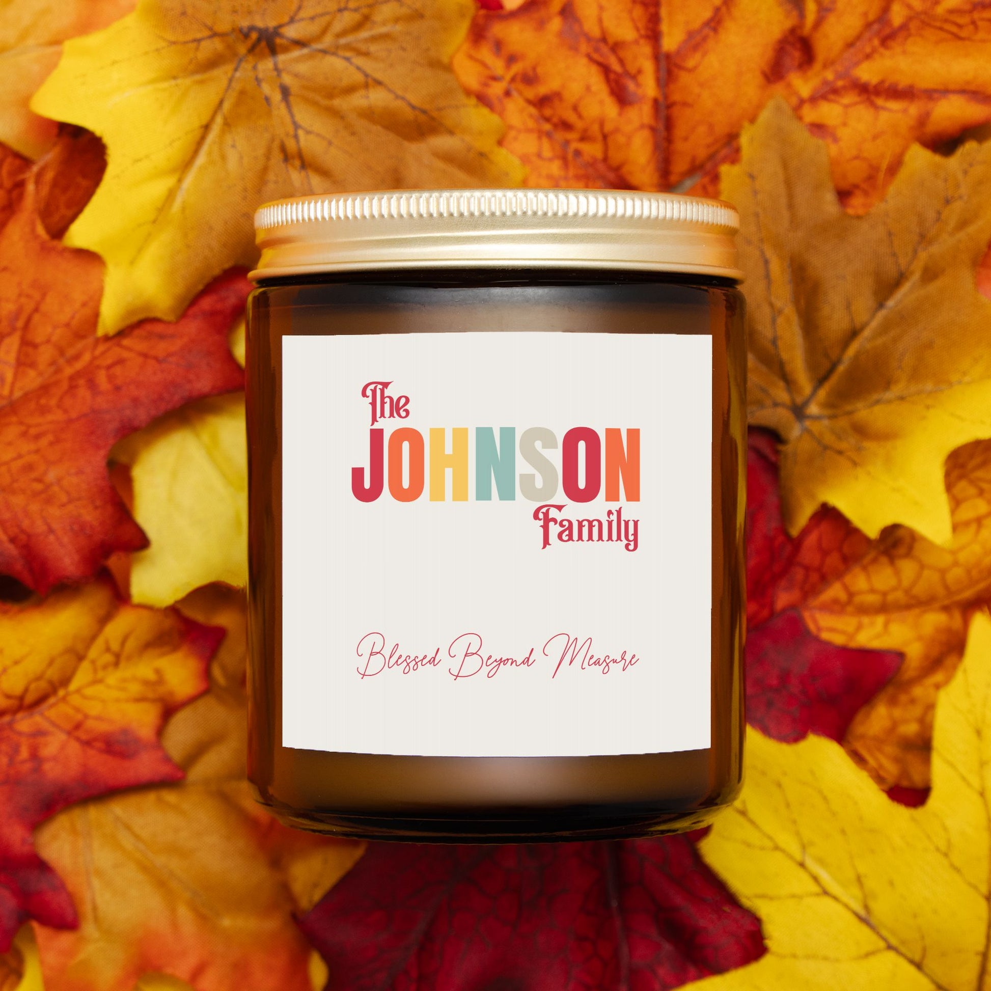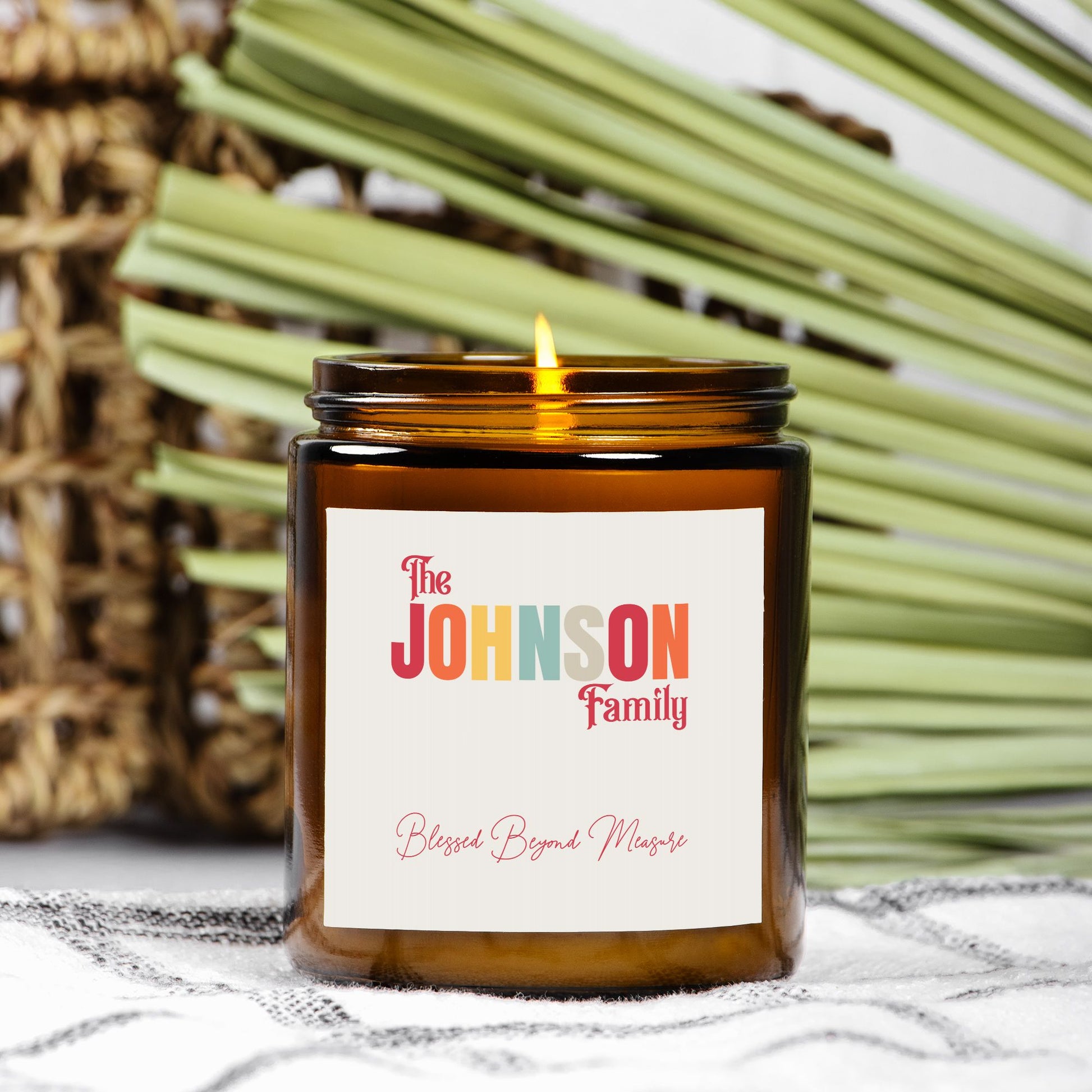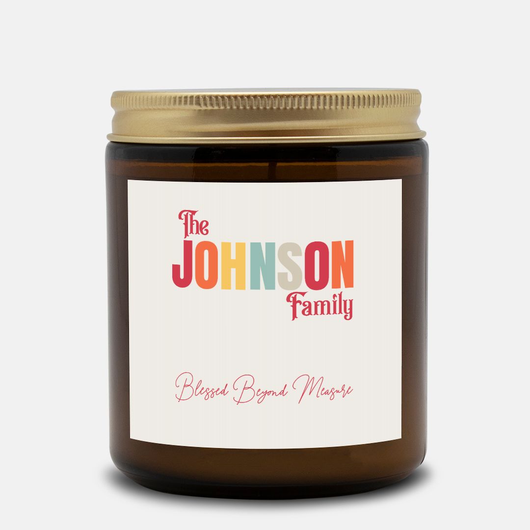 Fill your home with warmth, love, and light with our personalized family candle. Featuring your family’s last name beautifully displayed above the heartfelt phrase “Blessed Beyond Measure”. This frosted glass candle makes a meaningful keepsake or gift for any occasion. Perfect for celebrating family, faith, and togetherness. Our Amber Jar Candle is perfect for any style of decor and emits a special, vibrant, warm tone when lit. The coconut soy wax is a vegan blend, gluten-free, toxin-free, paraben-free, and phthalate-free, and comes from renewable sources.